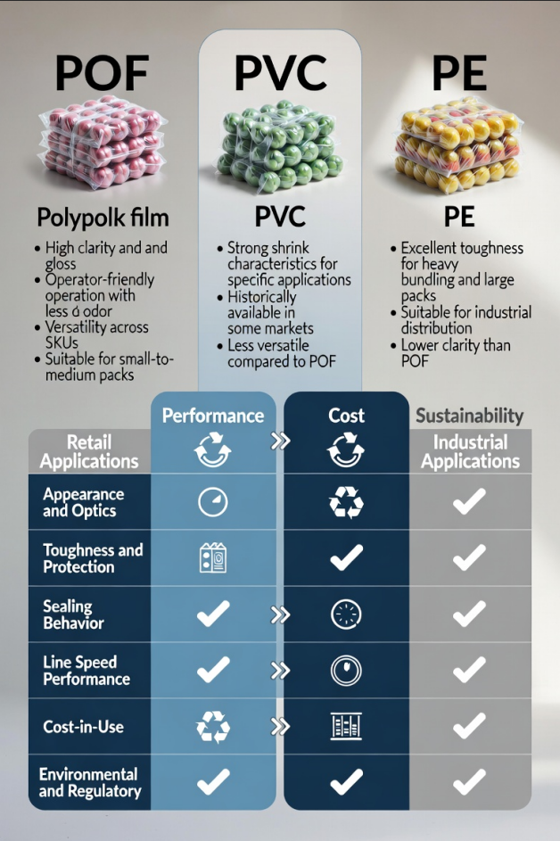 Em muitas operações modernas de embalagem, o POF é escolhido como uma solução mais versátil e amplamente aceita para embalagens de varejo e ambientes de produtos mistos.